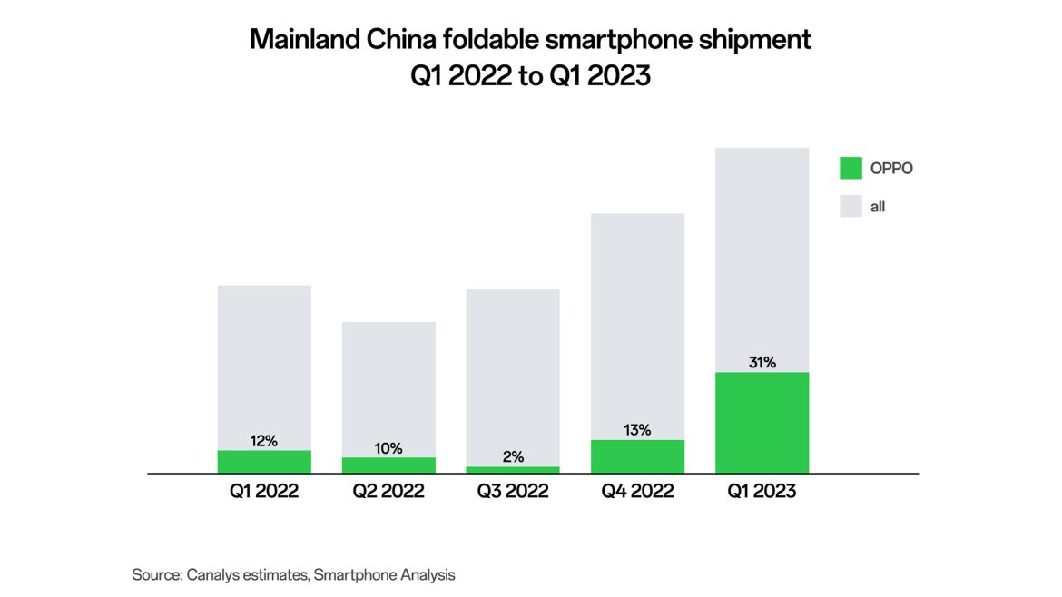 অন্যতম শীর্ষস্থানীয় গ্লোবাল স্মার্টফোন ব্র্যান্ড ‘অপো’ ‘ফাইন্ড এন২’ সিরিজ এবং ‘ফাইন্ড এক্স৬’ সিরিজের ফ্ল্যাগশিপ মোবাইল সেটগুলোর দুর্দান্ত পারফর্ম্যান্সের ফলে একই সময়ের ব্যবধানে ‘এইচ১ ২০২৩’ এ চীনের স্মার্টফোন বাজারে ১ম স্থান ও বিশ্বজুড়ে ৪র্থ স্থান অধিকার করে নিয়েছে। ক্যানালিস এর তথ্য অনুযায়ী, ৫১ দশমিক ৯ মিলিয়ন শিপমেন্ট সহ এইচ১ এ বৈশ্বিক স্মার্টফোন বাজারে অপো এর শেয়ার ১০% এবং এইচ১ ২০২৩ এ চীনের স্মার্টফোন বাজারে এই শেয়ারের পরিমাণ ১৮% – এতে করে বছরের প্রথম অর্ধাংশেই অপো চীনের ‘বেস্ট-সেলিং’ ব্র্যান্ড হয়ে দাঁড়িয়েছে। ফোল্ডেবল স্মার্টফোনের অভাবনীয় গ্রহণযোগ্যতার ফলে অপো আরো সফল ব্র্যান্ডে পরিণত হয়েছে, যা কি না এ বছরে কোম্পানিটির দ্রুত সমৃদ্ধিতে ভূমিকা রেখেছে এবং বহু সম্ভাবনার দ্বার খুলে দিয়েছে। কাউন্টারপয়েন্ট রিসার্চ অনুমান করছে- ৫৫ মিলিয়ন ইউনিটের লক্ষ্যে পৌঁছাতে ২০১৯ থেকে ২০২৫ সালের মধ্যে ফোল্ডেবল স্মার্টফোনের বিশ্বব্যাপী শিপমেন্ট ১১৪% ‘কম্পাউন্ড অ্যানুয়াল গ্রোথ রেট’ বৃদ্ধি প্রত্যাশা করা যাচ্ছে এবং এর মধ্যে শুধু ২০২২ থেকে ২০২৫ সালের মধ্যেই এই হার চারগুণ বাড়বে বলে মনে করা হচ্ছে। অপোসহ চীনা ‘ওইএম’গুলো খুব দ্রুতই ফোল্ডেবল বাজারের সাথে খাপখাইয়ে নিতে পেরেছে এবং ২০২২ সালে বাজারের ২৬% শেয়ার নিয়ে চীনের এই উত্থানেও অবদান রাখছে।