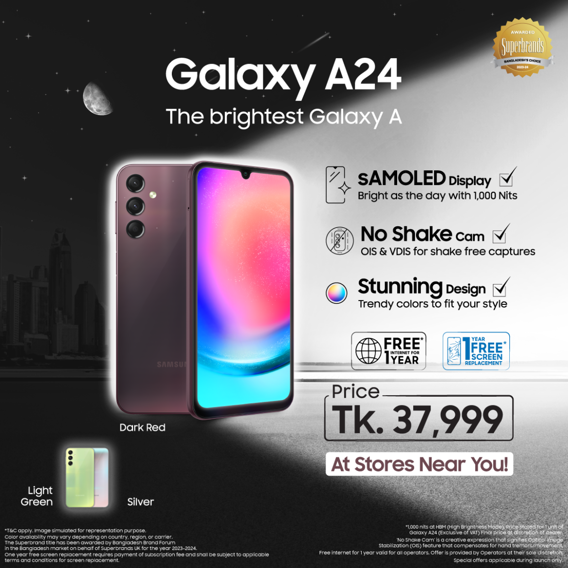 এ বিষয়ে স্যামসাং মোবাইলের হেড অব এমএক্স বিজনেস বলেন, “বাংলাদেশের বাজারে স্যামসাংয়ের লেটেস্ট ডিভাইস গ্যালাক্সি এ২৪ নিয়ে আসতে পেরে আমরা অত্যন্ত আনন্দিত। এই স্মার্টফোনের আকর্ষণীয় ফিচারগুলো ব্যবহারকারীরা উপভোগ করবেন বলে আমরা আশাবাদী। আমরা এ ধরনের স্মার্টফোন আরও নিয়ে আসতে ও ফোন ব্যবহারের সামগ্রিক অভিজ্ঞতাকে আরও সমৃদ্ধ করতে নিরলস কাজ করে যাচ্ছি।” একই প্রাইস-রেঞ্জের ফোনগুলোর মধ্যে ব্যবহারোপযোগিতা আর আকর্ষণীয় ফিচারের কারণে গ্যালাক্সি এ সিরিজের হ্যান্ডসেটগুলো অন্যতম জনপ্রিয় স্মার্টফোনে পরিণত হয়েছে। বিগত বছরগুলোতে নানান অফার নিয়ে এসেছে এই সিরিজের ফোনগুলো, এরই ধারাবাহিকতায় এবার নিয়ে আসা হয়েছে নতুন গ্যালাক্সি এ২৪। ডিভাইসটির মূল্য নির্ধারণ করা হয়েছে মাত্র ৩৭,৯৯৯ টাকা। সরাসরি অভিজ্ঞতা নিতে ফ্যানরা নিকটস্থ স্যামসাং অনুমোদিত স্টোর অথবা স্যামসাং বাংলাদেশের ফেসবুক পেইজ থেকে ঘুরে আসতে পারেন।