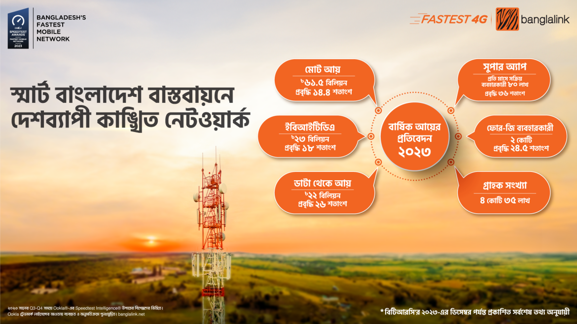দেশের অন্যতম উদ্ভাবনী ডিজিটাল সেবাদাতা প্রতিষ্ঠান বাংলালিংক, তাদের দুই অংকের প্রবৃদ্ধির ধারা অব্যাহত রেখেছে। অপারেটরটির বার্ষিক আয় আগের বছরের তুলনায় ১৪.৪ শতাংশ বেড়ে ২০২৩ অর্থবছরে ৬ হাজার ১৫০ কোটি টাকায় দাঁড়িয়েছে। বাংলালিংক-এর এই অর্জনে ভূমিকা রেখেছে এর ফোর-জি গ্রাহক সংখ্যার উল্লেখযোগ্য বৃদ্ধি, ‘ডিজিটাল অপারেটর ১৪৪০’ কৌশলের সঠিক বাস্তবায়ন, যার অর্থ হলো দিনের প্রতি মিনিটে গ্রাহকদের সাথে যুক্ত থাকা এবং দেশব্যাপী নেটওয়ার্কের উল্লেখযোগ্য সম্প্রসারণ। এই কৌশলগত পদক্ষেপগুলি বাংলালিংককে দেশের সবচেয়ে দ্রুতগতির ইন্টারনেট সেবা প্রদানকারী হিসাবে প্রতিষ্ঠিত করেছে, যা বাংলাদেশের ডিজিটাল সেবা প্রদানের ক্ষেত্রে নতুন মান প্রতিষ্ঠা করেছে। সম্প্রতি, বাংলালিংক তার নেটওয়ার্ক কভারেজ দ্বিগুণ করেছে, তাদের মোট টাওয়ার সংখ্যা বেড়েছে ১৬,০০০ হাজারের বেশি। বাংলালিংক-এর উচ্চ গতি ও মানসম্মত নেটওয়ার্ক এর পাশাপাশি মাইবিএল সুপার অ্যাপ, টফি ও বিপ-এর মতো উদ্ভাবনী ডিজিটাল সেবাগুলি এই ভালো ফল অর্জনে গুরুত্বপূর্ণ ভূমিকা পালন করেছে। বাংলাদেশ টেলিযোগাযোগ নিয়ন্ত্রণ কমিশন (বিটিআরসি)-এর তথ্য অনুসারে, ডিসেম্বর ২০২৩ পর্যন্ত বাংলালিংক- এর গ্রাহকের সংখ্যা ৪ কোটি ৩৫ লাখ। সম্প্রতি বাংলালিংক-এর মূল কোম্পানি ভিওন প্রকাশিত ২০২৩ সালের বার্ষিক আয়ের প্রতিবেদন অনুসারে অপারেটরটির ফোর-জি ব্যবহারকারীর সংখ্যা ২৪.৫ শতাংশ বৃদ্ধি পেয়েছে, যা ২ কোটি ফোর-জি