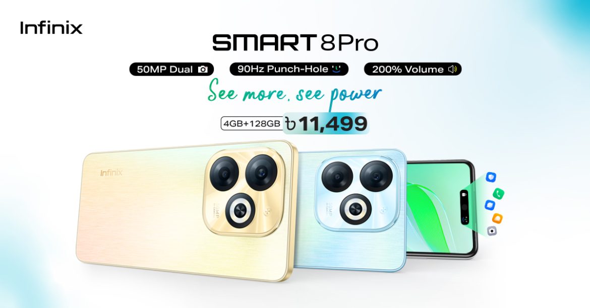 পছন্দের অ্যাপ, ছবি, ভিডিওসহ নানা কিছু সহজেই সংরক্ষণ করতে এতে আছে ১২৮ জিবি স্টোরেজ। পাশাপাশি মাইক্রোএসডির সাহায্যে এর ধারণক্ষমতা ২ টেরাবাইট পর্যন্ত বাড়ানো যাবে। স্মার্ট ৮ প্রো-তে আছে ম্যাজিক রিংযুক্ত ৬.৬ ইঞ্চি এইচডি+ পাঞ্চ-হোল ডিসপ্লে। এই ম্যাজিক রিং-এর মাধ্যমে চার্জিং স্ট্যাটাস এবং অন্যান্য নোটিফিকেশন নির্বিঘ্নে দেখা যায়। ৯০ হার্টজের রিফ্রেশ রেটের কারণে ব্রাউজিংয়ের সময় পাওয়া যাবে না কোনো ল্যাগ; যা ব্যবহারকারীদের স্বচ্ছন্দ টাচের অভিজ্ঞতার নিশ্চিত করবে। ডিভাইসটির রিং ফ্ল্যাশলাইটযুক্ত ৫০ মেগাপিক্সেলের ডুয়েল এআই ক্যামেরার সাহায্যে স্বল্প আলোতেও সুন্দর ছবি তোলা যায়। ৮ মেগাপিক্সেলের ফ্রন্ট ক্যামেরার মাধ্যমে ব্যবহারকারীরা সামাজিক যোগাযোগমাধ্যমে শেয়ার করার জন্য চমৎকার সেলফি তুলতে পারবেন। তরুণদের পছন্দের কথা মাথায় রেখে ডিজাইন করা হয়েছে ইনফিনিক্স স্মার্ট ৮ প্রো। টিম্বার ব্ল্যাক, শাইনি গোল্ড ও রেইনবো ব্লু এই তিনটি ট্রেন্ডি রঙে পাওয়া যাচ্ছে ফোনটি। সারা দেশের ইনফিনিক্স অফিশিয়াল রিটেইল স্টোরে পাওয়া যাচ্ছে ইনফিনিক্স স্মার্ট ৮ প্রো। ফোনটির দাম মাত্র ১১,৪৯৯ টাকা।