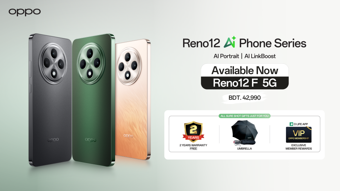 আরামদায়কভাবে হাতে রাখার সুবিধার পাশাপাশি মজবুত ডিজাইনের রেনো১২ এফ ৫জি-এর অল- অ্যারাউন্ড আর্মার প্রটেকশন ফোনের দীর্ঘস্থায়ী ব্যবহার নিশ্চিত করবে। ওয়াটার রেজিস্ট্যান্স সার্টিফিকেশন ও স্প্ল্যাশ টাচ প্রযুক্তি এই ডিভাইসটিকে করে তুলেছে শক্তিশালী ও স্টাইলিশ। ৪৫ওয়াট সুপারভুক ফাস্ট চার্জিং প্রযুক্তির ফোনটির ৫০০০ এমএএইচ ব্যাটারি দেবে দীর্ঘ সময় ধরে পারফরম্যান্সের নিশ্চয়তা। প্রথম থেকে ৫০ মাস পর্যন্ত নির্বিঘ্নে ব্যবহার করা যাবে ফোনটি। অপো বাংলাদেশের অথোরাইজড এক্সক্লুসিভ ডিস্ট্রিবিউটরের ম্যানেজিং ডিরেক্টর ড্যামন ইয়াং বলেন, “এআই প্রযুক্তি এখন স্মার্টফোন ব্যবহারকারীদের জন্য অত্যন্ত গুরুত্বপূর্ণ। অপো রেনো১২ এফ ৫জি ফোনটি উন্নত এআই ও ৫জি প্রযুক্তির সমন্বয়ে ব্যবহারকারীর অভিজ্ঞতা মান বাড়াতে আমাদের প্রতিশ্রুতিকে প্রতিফলিত করে। বাংলাদেশের বাজারে এই অসাধারণ ডিভাইসটি নিয়ে আসতে পেরে আমরা অত্যন্ত আনন্দিত।” রেনো১২ এফ ৫জি ডিভাইসটি কিনলেই গ্রাহকরা বিশেষ উপহার হিসেবে পাচ্ছেন ২ বছরের ওয়ারেন্টি, একটি ছাতা এবং এক্সক্লুসিভ মেম্বার রিওয়ার্ডস। অ্যাম্বার অরেঞ্জ ও অলিভ গ্রিন – দুইটি আকর্ষণীয় রঙে পাওয়া যাচ্ছে অপো রেনো১২ এফ ৫জি (১২জিবি+২৫৬জিবি)। দেশজুড়ে অপো’র অনুমোদিত আউটলেটগুলোতে স্মার্টফোনপ্রেমীরা নতুন এই ডিভাইসটি পেয়ে যাবেন মাত্র ৪২,৯৯০ টাকায়।