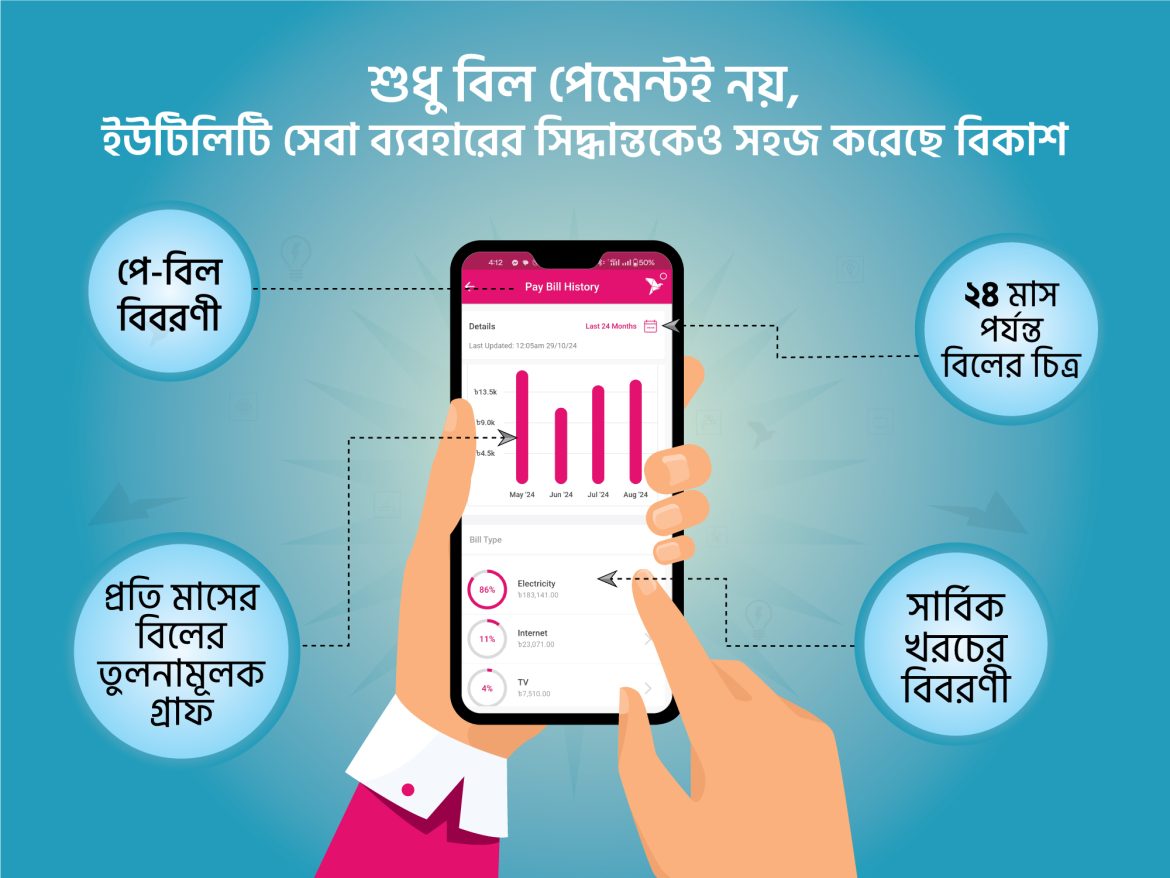 প্রত্যেক গ্রাহকের শেষ ২৪ মাসের পে-বিল এর তথ্য দিয়ে স্বয়ংক্রিয়ভাবে চমৎকার গ্রাফ তৈরি করে দেয় বিকাশ অ্যাপ। তাতে মাসে কতো টাকা খরচ হয়েছে তার বিস্তারিত যুক্ত থাকে। একই সাথে কোনো ধরনের বিল-যেমন বিদ্যুৎ, পানি, গ্যাস, ইন্টারনেট সহ অন্যান্য বিল কোনটা কতো পরিমাণ ছিল তার একটা তুলনামূলক উপস্থাপন দেখেতে পারেন গ্রাহক। গ্রাফিক দিয়ে উপস্থাপিত হওয়ায় এক নজরেই সামগ্রিক বিলের খরচ খুব সহজেই বুঝতে পারেন যেকোনো গ্রাহক। নিজের পছন্দানুসারে ৬, ১২ অথবা ২৪ মাসের তুলনামূলক তথ্য অপশন থেকে নির্বাচন করে নিতে পারেন গ্রাহক। সিলেটের গৃহিণী জেবা রহমানের জন্য পে-বিল বিবরণীটা তাঁর মিতব্যয়ী হওয়ার ক্ষেত্রে ভূমিকা রাখে। জেবা বলেন, আমাদের মতো যারা নির্দিষ্ট মাসিক বেতনের উপর জীবনযাপন করতে হয় তাঁদের জন্য সবকিছুই অনেক হিসাবে রাখা জরুরি হয়ে পড়ে। কোনো রকম ঝামেলা ছাড়াই পরিশোধ করা যায় দেখে আমাদের বিদ্যুৎ, গ্যাস, পানি, ইন্টারনেট সব বিলই আমি বিকাশ দিয়ে পরিশোধ করি প্রায় দুই বছর হলো। প্রতিমাসেই পে-বিল বিবরণীর এই গ্রাফটা কোথায় কতটুকু সাশ্রয়ী হতে হবে সেই পথটা দেখায়। বিষয়টা বড় স্বস্তির।