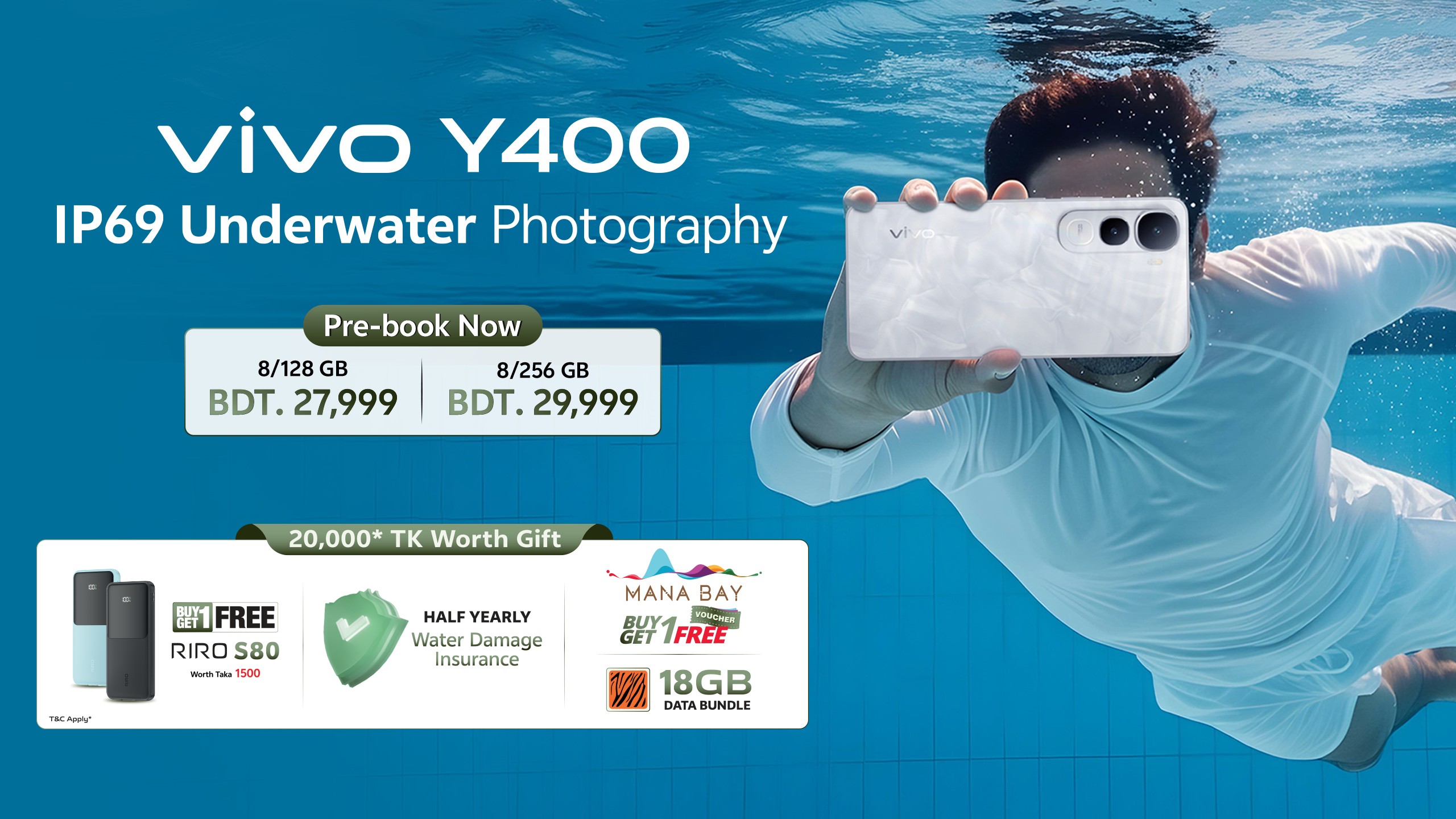 অপেক্ষার পালা শেষ! কেননা, আইপি৬৯ সহ আন্ডারওয়াটার ফটোগ্রাফি সুবিধা এবং ফ্ল্যাটফ্রেম-ইউনিবডি ডিজাইনের ভিভো ওয়াই৪০০ এর প্রি-অর্ডার শুরু হয়ে গিয়েছে। ৩১ জুলাই থেকে ৫ আগস্ট পর্যন্ত ভিভোর অফিসিয়াল ই-স্টোর অথবা যে কোনো অথোরাইজড শপ থেকে প্রি-অর্ডার করতে পারবেন ক্রেতারা।