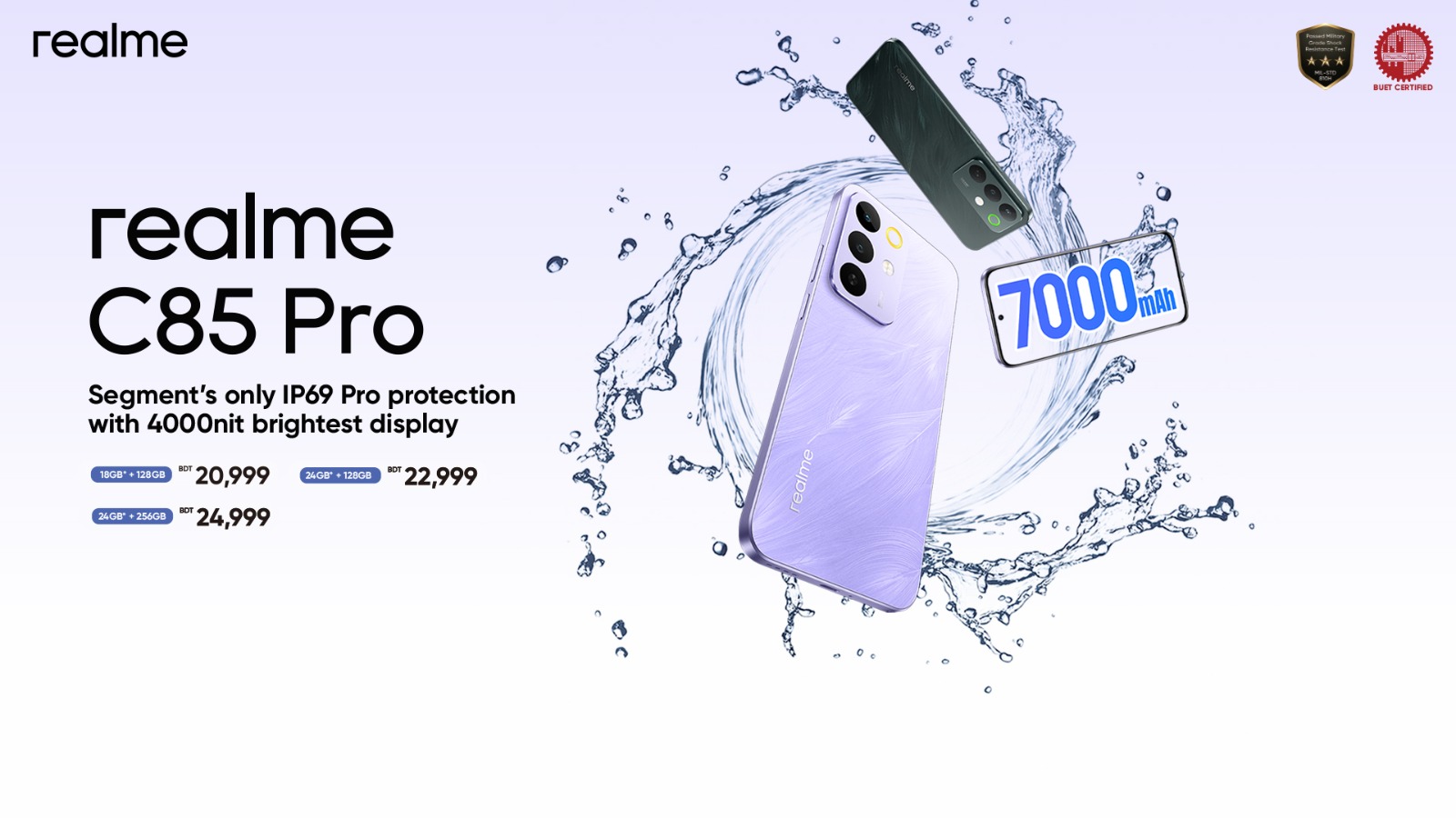 বাংলাদেশে বহুল প্রতীক্ষিত রিয়েলমি সি৮৫ প্রো উন্মোচনের ঘোষণা দিয়েছে তরুণদের পছন্দের স্মার্টফোন ব্র্যান্ড রিয়েলমি। ‘ক্যাটাগরির প্রথম অফিসিয়াল ওয়াটারপ্রুফ স্মার্টফোন’ রিয়েলমি সি৭৫–এর অবিশ্বাস্য সাফল্যের ধারাবাহিকতায় এই সেগমেন্টের সবচেয়ে ওয়াটার–রেজিজট্যান্ট ও উজ্জ্বলতম ফোন হিসেবে এটি নিয়ে আসা হলো।